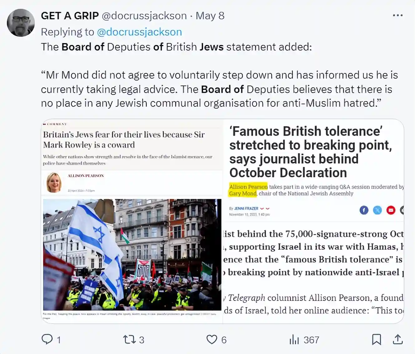 英国学生的行为自然引起了当地犹太学生的不满,英国犹太委员会进行了大规模的施压活动,认为伦敦警察局SirMarkRowley对待学生太过软弱,从而导致英国的犹太担心自己的生命安全,他们利用每日邮报、英国广播公司等多家媒体平台进行批评,直接称呼SirMarkRowley为懦夫(下图),因为美国对学生都采取的强硬措施。