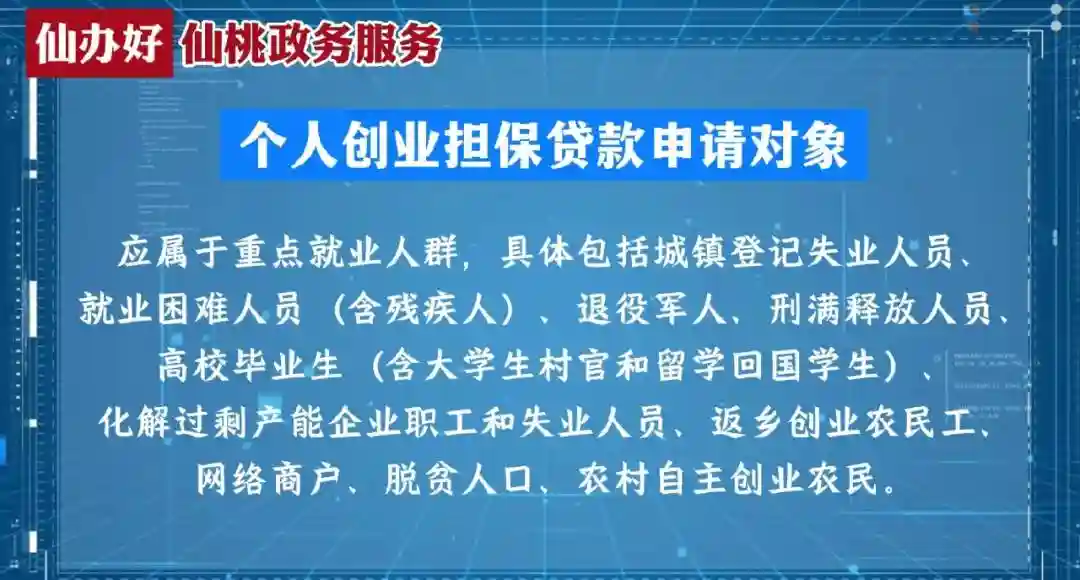 个人创业担保贷款申请对象应属于重点就业人群,具体包括城镇登记失业人员、就业困难人员(含残疾人)、退役军人、刑满释放人员、高校毕业生(含大学生村官和留学回国学生)、化解过剩产能企业职工和失业人员、返乡创业农民工、网络商户、脱贫人口、农村自主创业农民。个人申请贷款时,要求除助学贷款、脱贫人口小额信贷、住房贷款、购车贷款、5万元(含5万元)以下小额消费贷款(含信用卡消费)以外,本人及其配偶无其他贷款,且无不良信用记录。