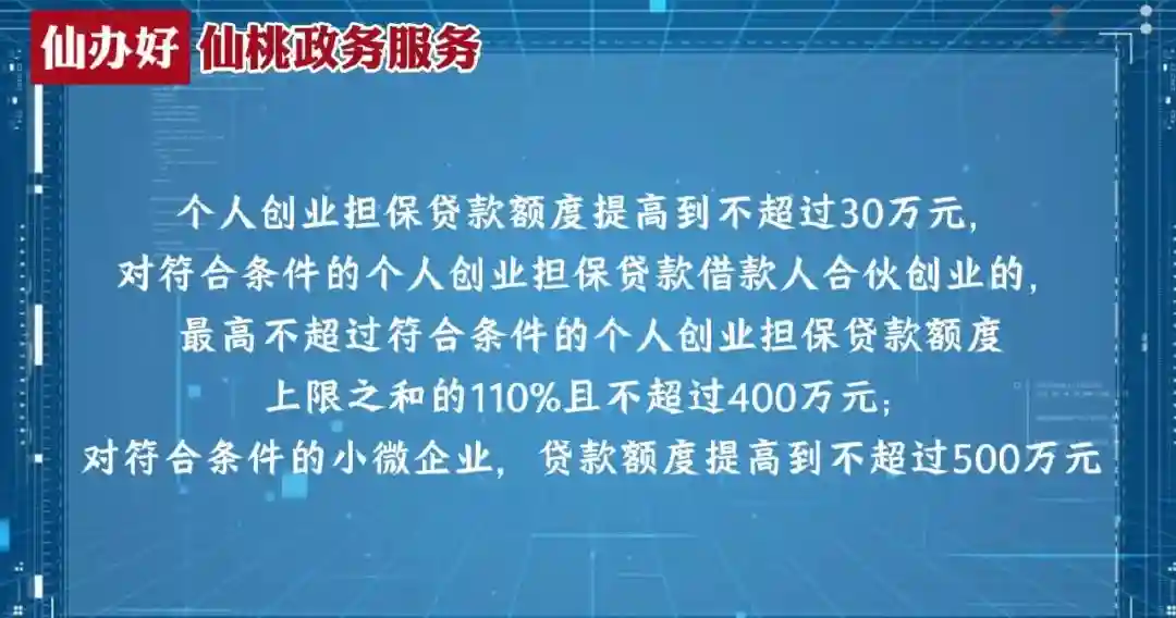 去年11月,湖北省出台文件明确了最新的贷款额度和财政贴息标准,其中个人创业担保贷款额度提高到不超过30万元,对符合条件的个人创业担保贷款借款人合伙创业的,最高不超过符合条件的个人创业担保贷款额度上限之和的110%且不超过400万元;对符合条件的小微企业,贷款额度提高到不超过500万元。创业担保贷款利率是由借款人、经办银行、创业担保基金运营管理机构或政府性融资担保机构协商确定。仙桃的贷款利率上限为人民银行公布的年基准利率上浮150个基点,例如这个月的年基准利率是3.35%,创业担保贷款的年利率不能超过4.85%,财政部门给予贷款实际利率的50%的财政贴息,那么创业者所承担的年贷款利率最高不超过2.425%。