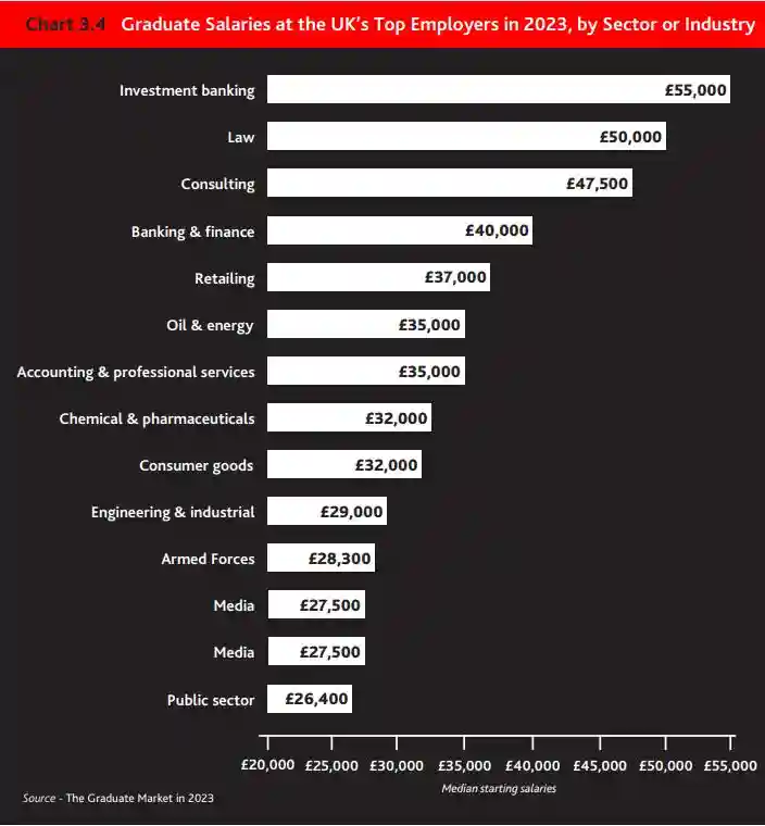 •2023年最慷慨的薪酬来自投资银行(中位数为5.5万英镑)、律师事务所(中位数为5万英镑)和咨询公司(中位数为4.75万英镑)。