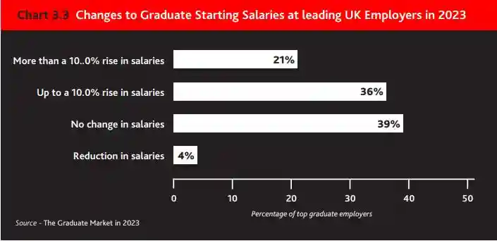 在研究中,超过一半的雇主今年都在给毕业生加薪——与2022年相比,大多数加薪幅度高达10.0%(见图3.3),但五分之一的雇主加薪幅度更大。五分之二的雇主不打算改变他们的起薪,四家机构已经降低了今年新员工的起薪。
