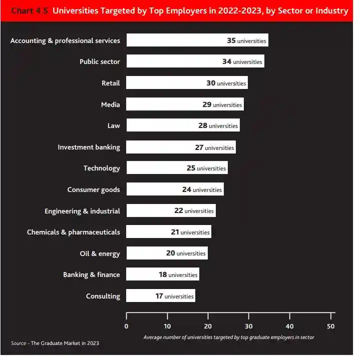 在2022-2023年的招聘季,随着许多顶级雇主回到校园参加亲自招聘活动,针对特定大学的目标有所增加,雇主瞄准的机构数量也有所增加——从2020-2021年的平均21所大学增加到2022-2023年的27所大学(见图4.4)。会计及专业服务公司、公营部门雇主及零售商均积极公布本地大学的毕业生职位空缺(见图4.5)。