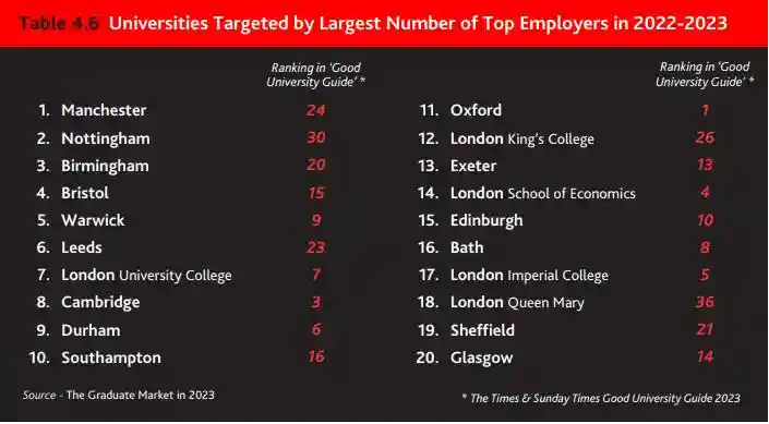 •在2022-2023年,最受顶尖毕业生雇主青睐的10所大学是曼彻斯特、诺丁汉、伯明翰、布里斯托、华威、利兹、伦敦大学学院、剑桥、杜伦和南安普顿。