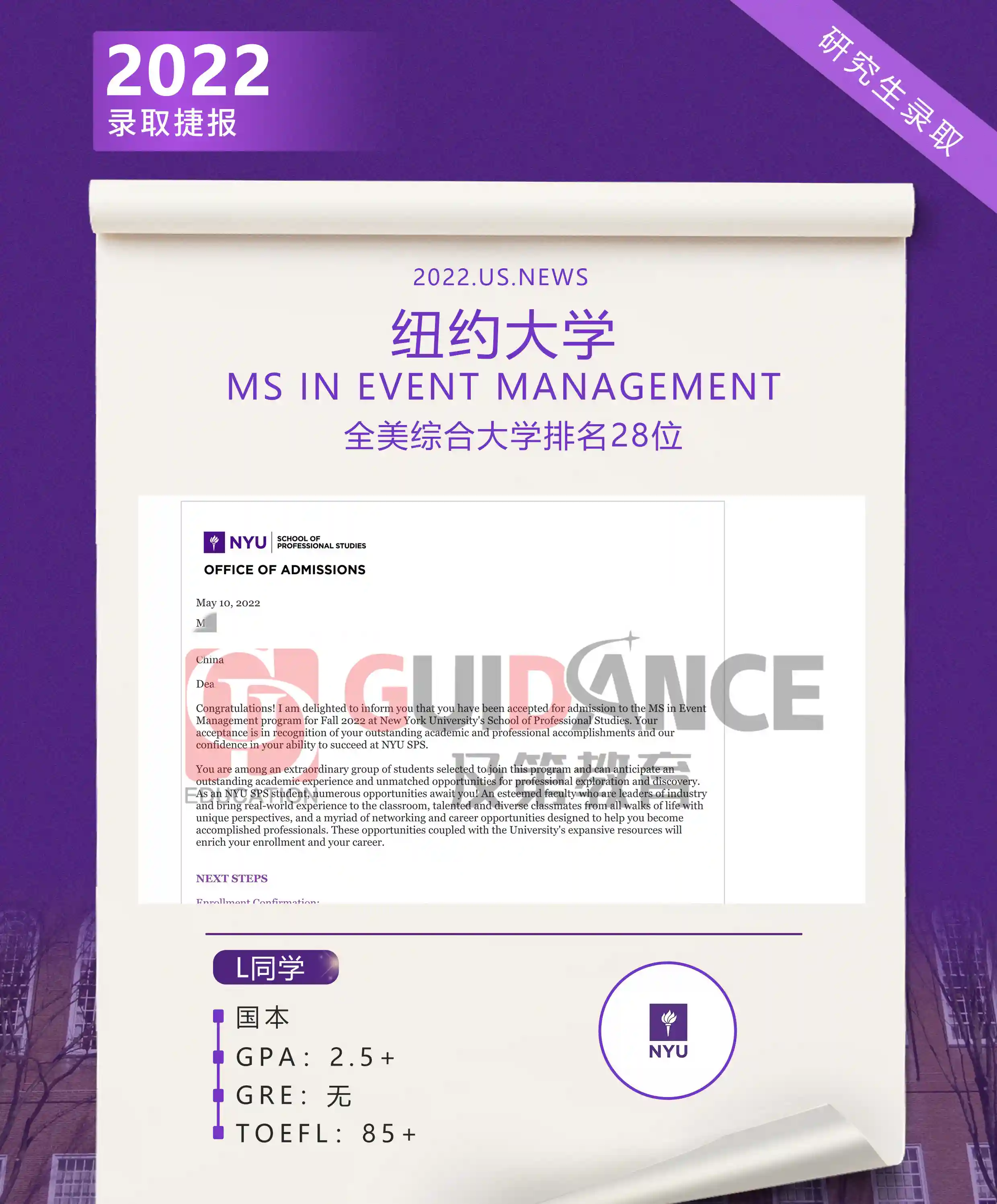 国本的学生想要获得纽约大学研究生录取offer的话,成绩可参考及第留学学员,GPA:2.5+,GRE:无,TOEFL:85+,接下来就为大家进行详细的解析: