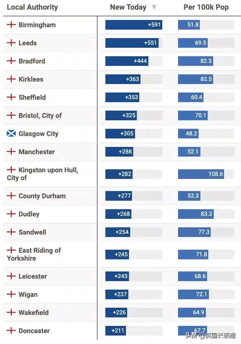 此外,利兹(+551)、谢菲尔德(+353)、布里斯托(+325)、曼彻斯特(+288)、杜伦郡(+277)、莱斯特(+243)等日增均超过200例。