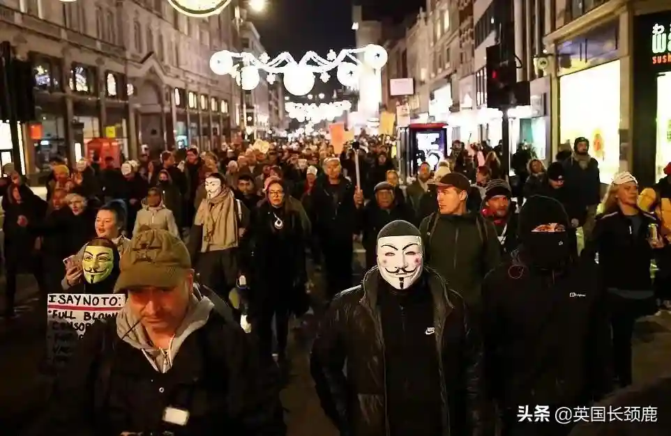 据悉,“百万面具游行”是一年一度的反独裁示威活动,今年更吸引了大量对Covid新一轮限制措施感到愤怒的人。抗议示威人群一边演奏着音乐,一边高喊着“自由”,穿过theStrand,TrafalgarSquare,OxfordCircus和Soho区。