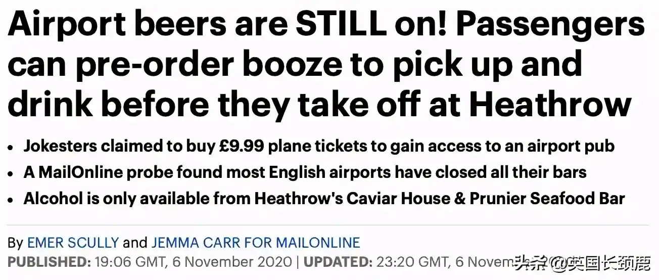 英格兰二次封锁期间所有酒吧关闭,英国人对酒精的渴望已经难以抑制了不过!希思罗机场的啤酒还在供应!乘客还可以在希思罗机场起飞前预订酒喝!