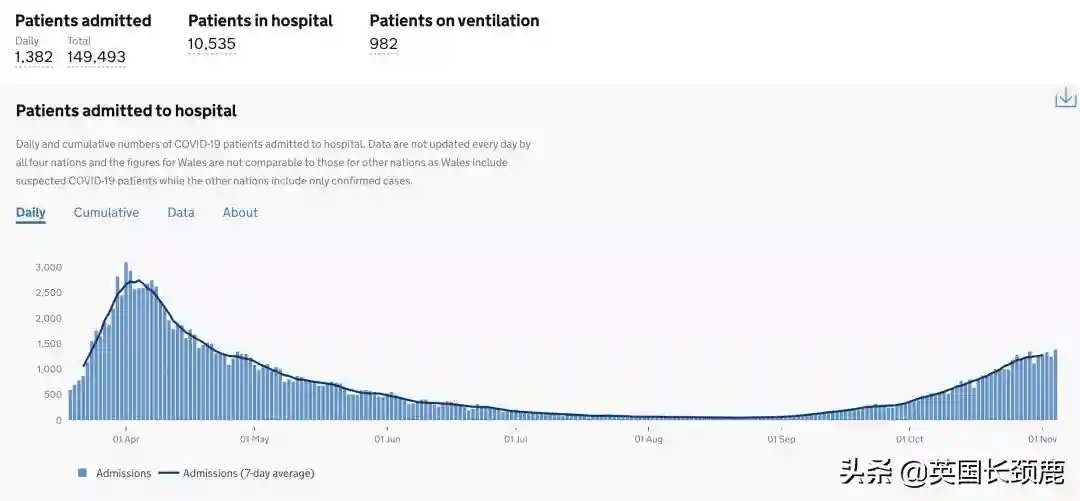 11月7日数据:目前住院的确诊新冠患者10,535人(+191),累计住院新冠患者总数为149,493人(+1,382)。