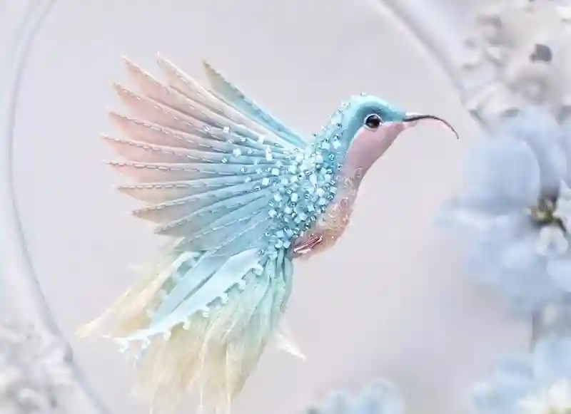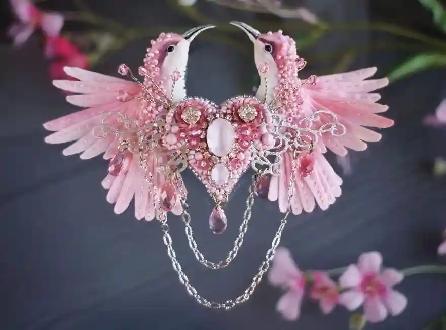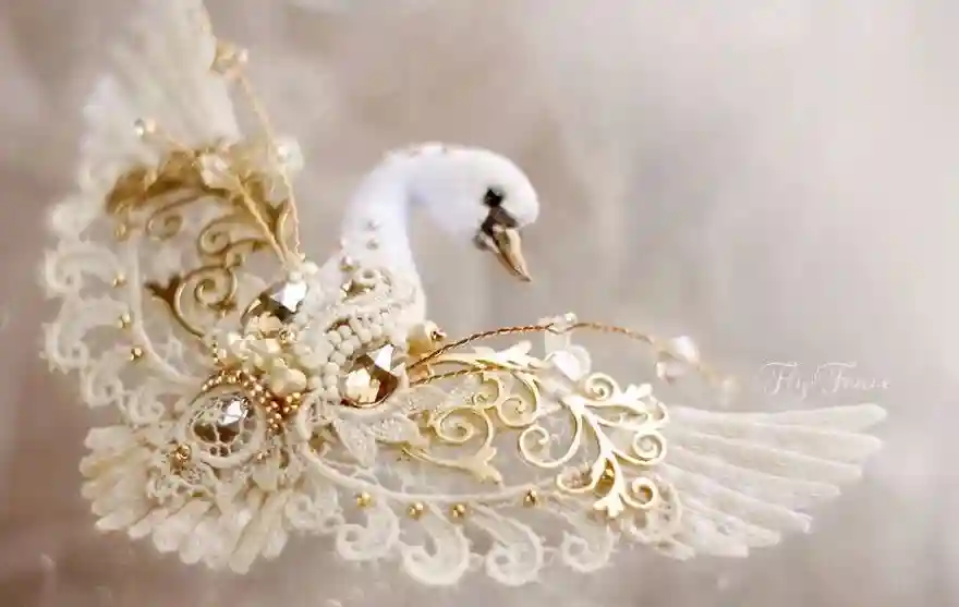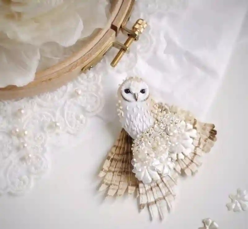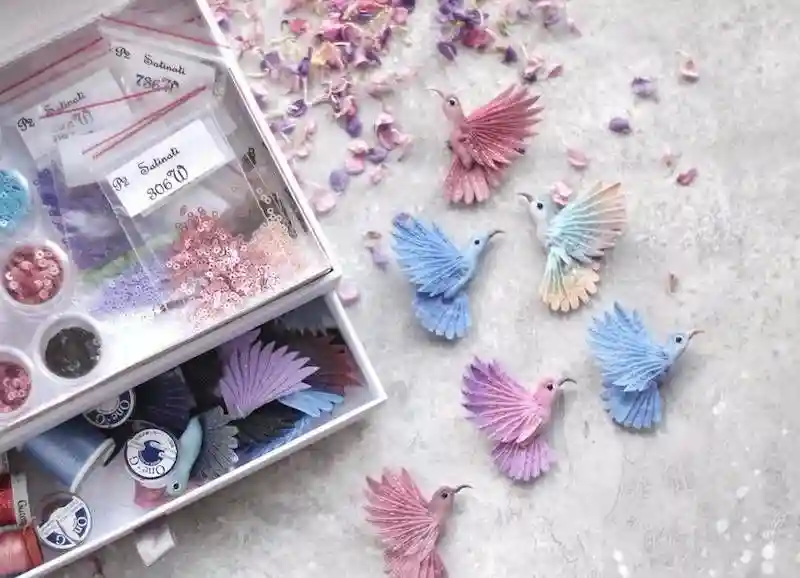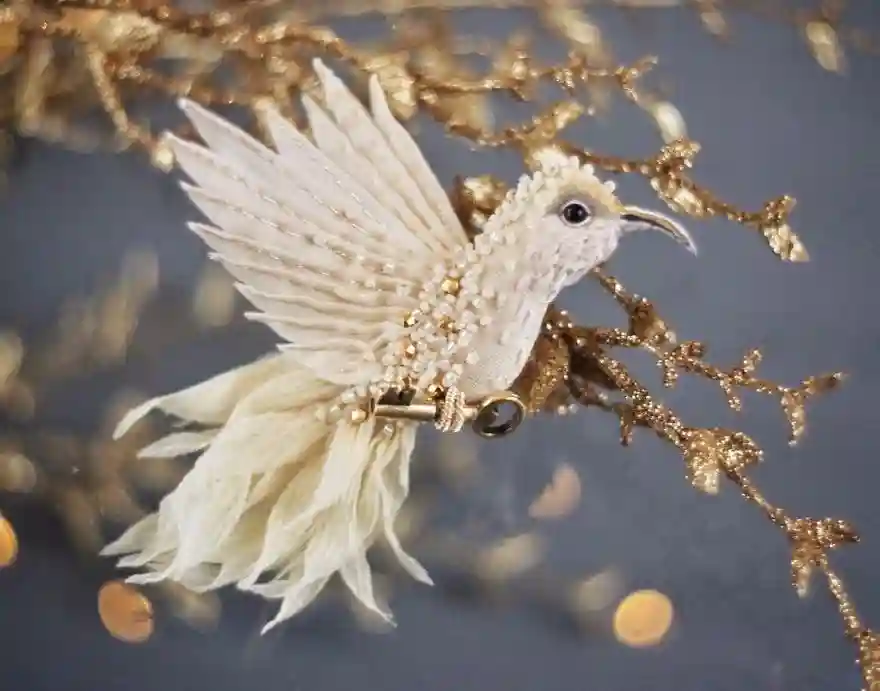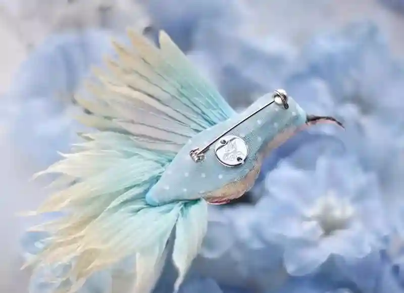 每一件作品,JuliaGorina都把它当作艺术品来设计和制作,而精致,优雅和美丽则是这些飞鸟的代名词。胸针和配饰由丝绸、珠子、亮片、水钻、蕾丝花边以及不同的镀金高质量配件为材料,结合缝纫、刺绣、手绘等多种工艺纯手工制作完成。