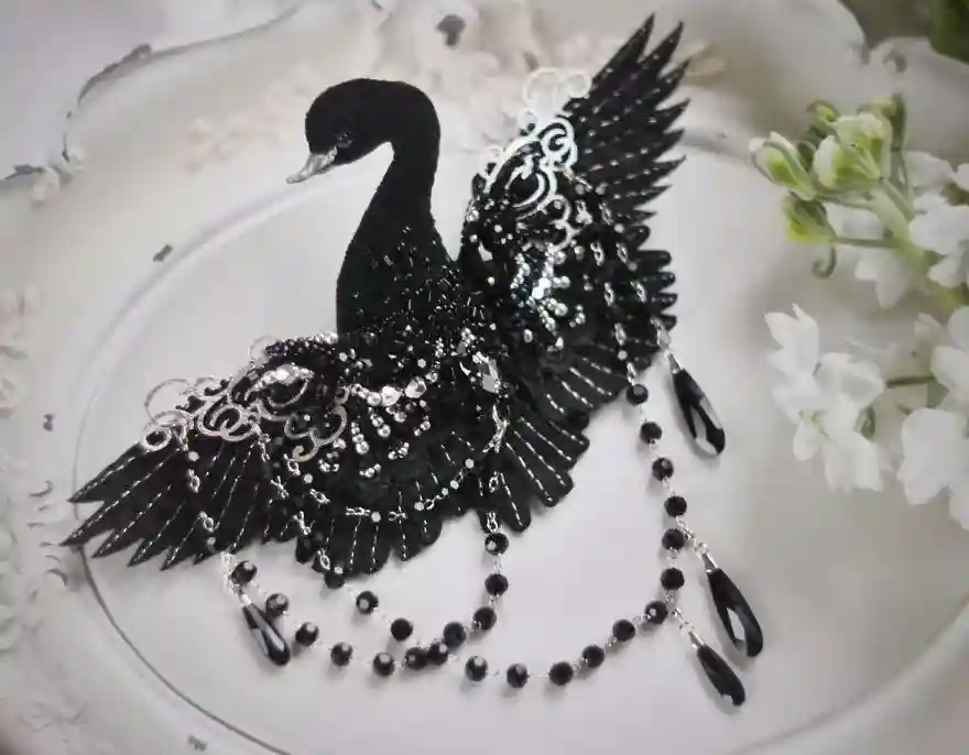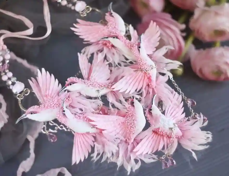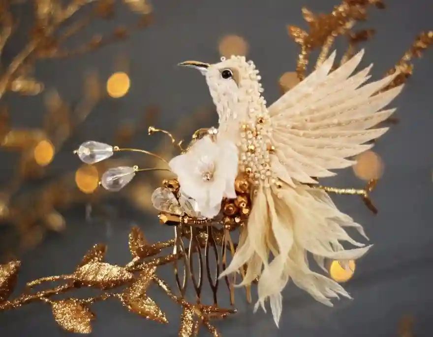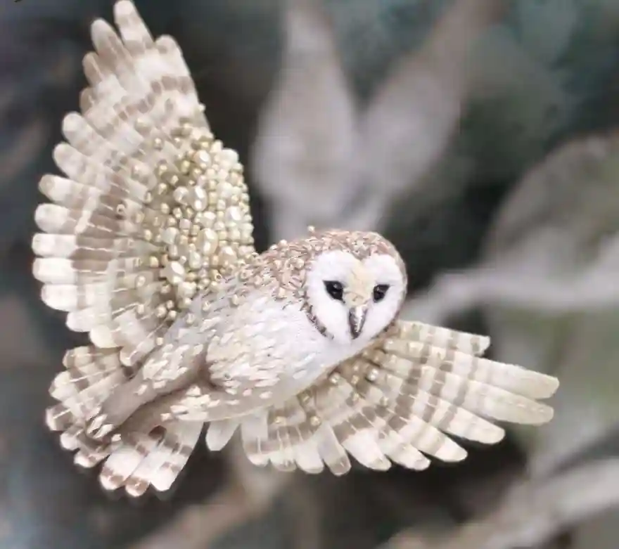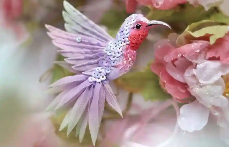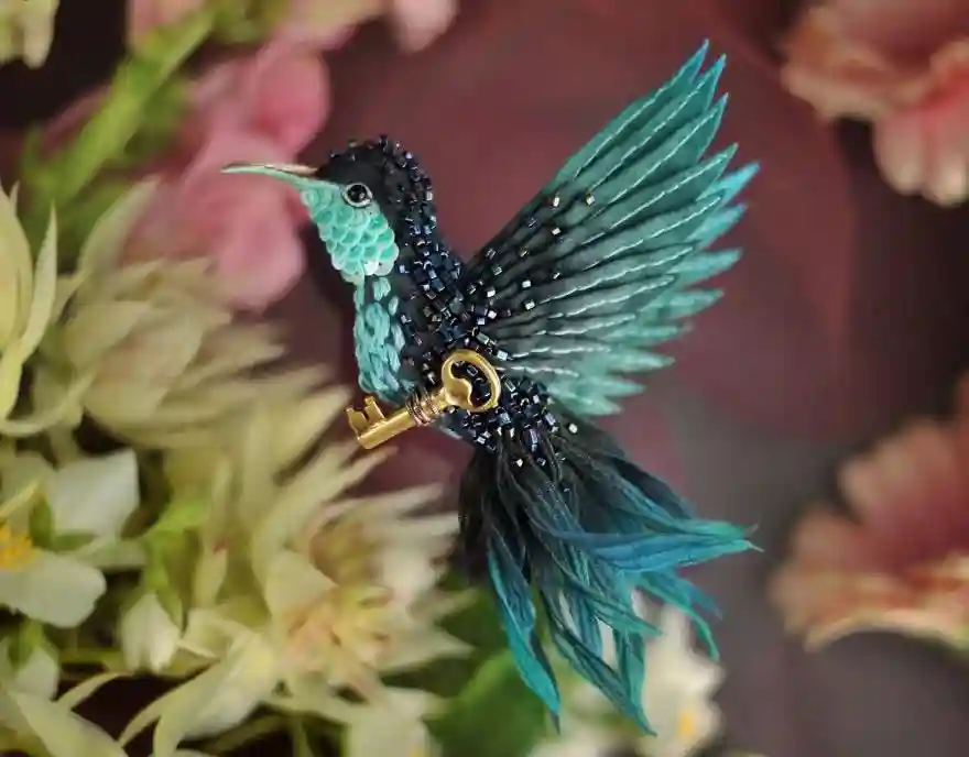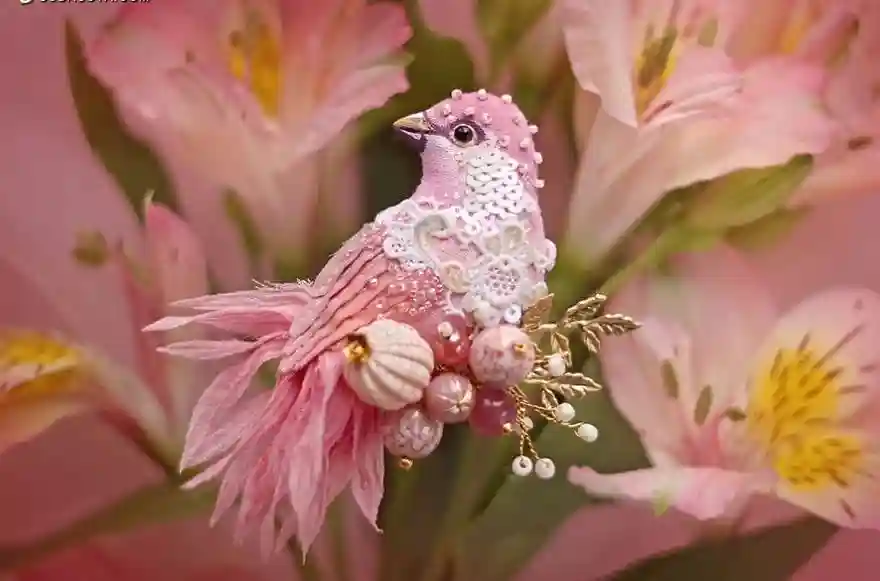 每一件作品,JuliaGorina都把它当作艺术品来设计和制作,而精致,优雅和美丽则是这些飞鸟的代名词。胸针和配饰由丝绸、珠子、亮片、水钻、蕾丝花边以及不同的镀金高质量配件为材料,结合缝纫、刺绣、手绘等多种工艺纯手工制作完成。