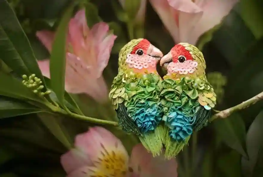 在Julia的工作室里,充盈着各色线材、珠子、亮片等材料,她用人们司空见惯的这些装饰品制作小鸟