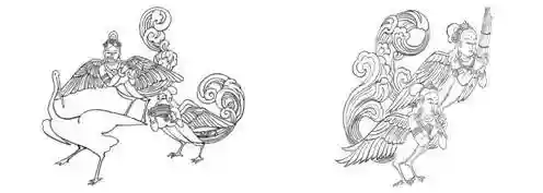 对照学者所绘线图(图八a,图八b),我们发现两个迦陵频伽手中所持物并非乐器,左侧迦陵频伽双手缚持一鸟,从鸟伸出头部的姿势来看显然是试图尽力挣脱束缚;右侧迦陵频伽右手持一树叶状物体,左手摊开。欧阳琳认为左侧迦陵频伽双手怀抱着吉祥雁鸟,雁鸟伸颈张望,右侧迦陵频伽右手握着蓓蕾。两个迦陵频伽装束、步态基本相同,只是修长尾羽姿势不同,一为上翘,一为向后伸展。两个迦陵频伽抬起右爪向前试探行走这一细节,很可能表明两个迦陵频伽是在向药师佛奉献贡品。
