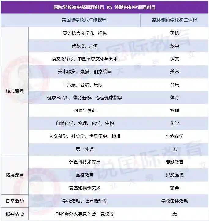 那么国际学校和体制内学校的课程差异到底是什么呢?我们就通过另外一张对比表格具体看看吧——